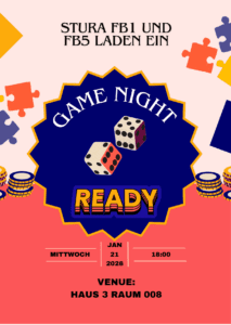 Lust auf einen richtig guten Abend abseits von Vorle­sungen und Abgaben? Dann kommt zur Game Night von StuRa FB1 & FB5. Wir sorgen für eine Auswahl an Spielen, ihr bringt einfach gute Laune mit. Eigene Spiele sind natürlich auch ausdrücklich willkommen.